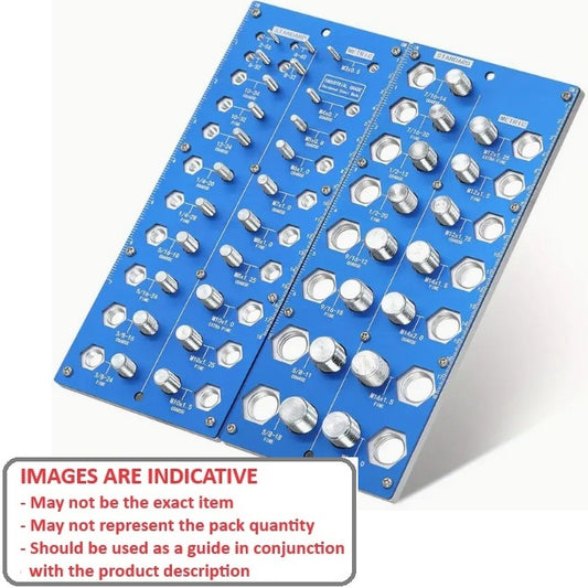 | Material: Steel on Wood Sizes: 7/16-14, 7/16-20, 1/2-13, 1/2-20, 9/16-12, 9/16-18, 5/8-11, 5/8-18 Sizes: M3, M4, M5, M6, M7, M8x1, M8x1.25, M10x1, M10x1.25, M10x1.5 Sizes: M12x1.25, M12x1.5, M12x1.75, M14x1.5, M14x2, M16x1.5, M16x2 Package: Contained on two aluminium boards each approx 10x26 cm For: Perfect for checking thread size on screws or nuts | ||||||